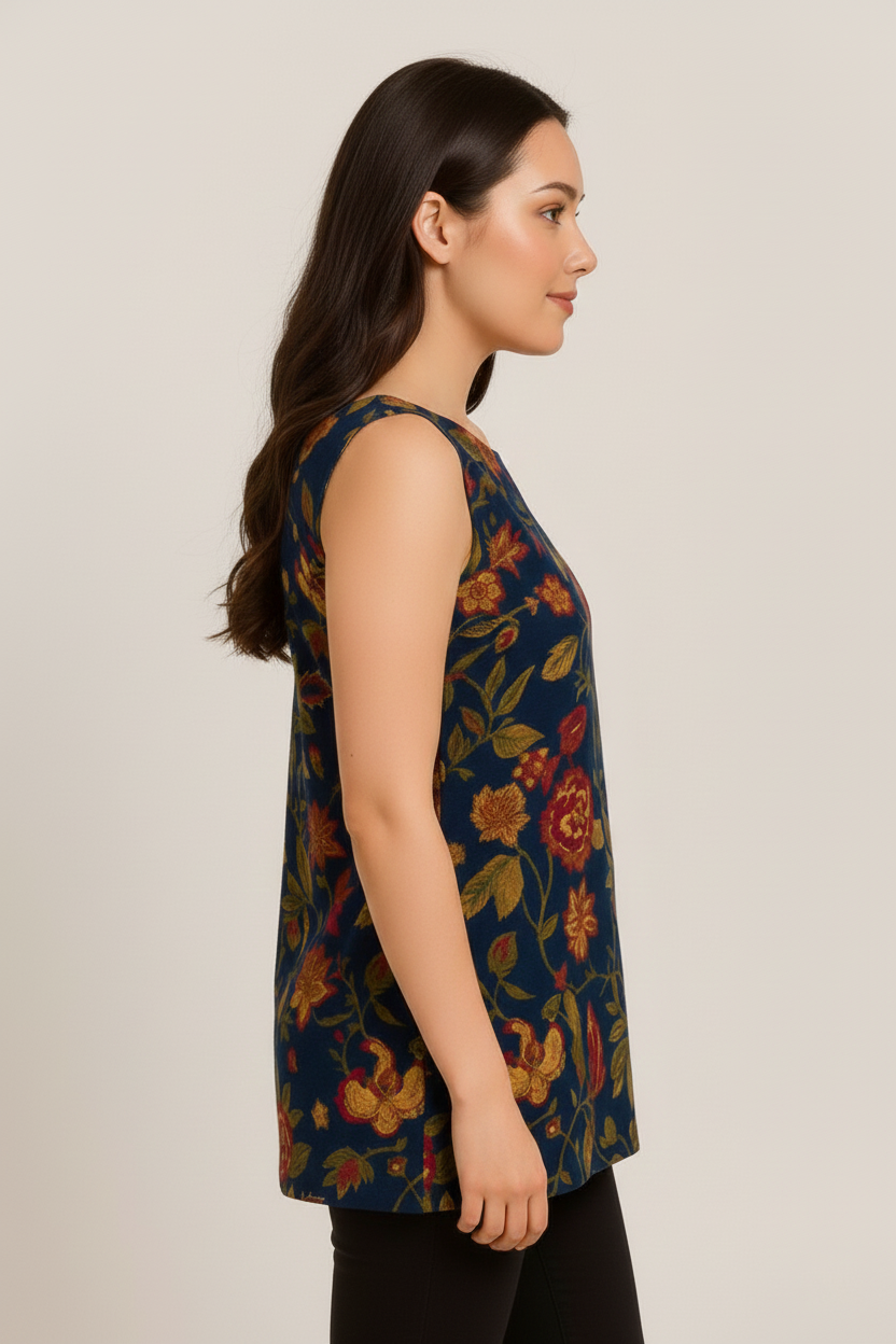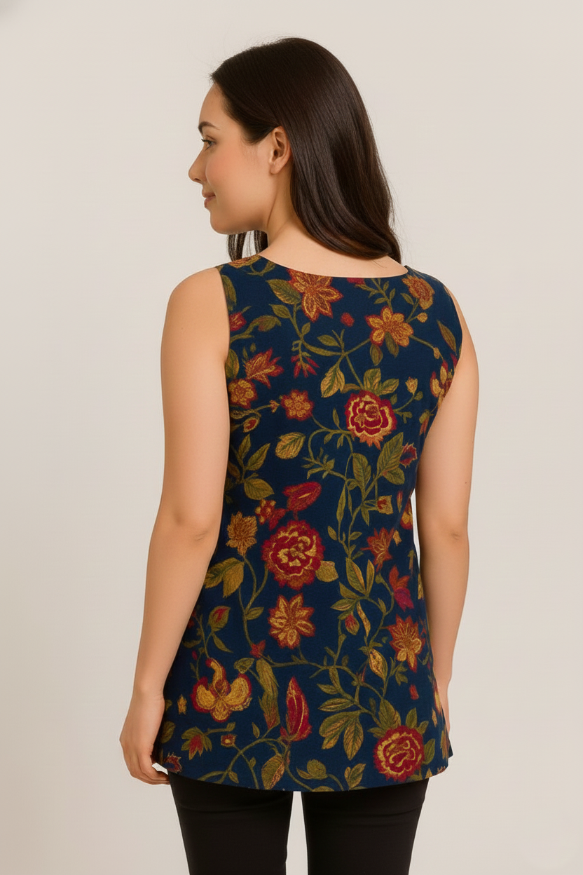 This striking short kurti combines the comfort of natural fibers with a feminine, tailored aesthetic. Crafted from 100% breathable cotton, the garment features a deep navy base decorated with an intricate, multi-colored floral and vine pattern in warm autumnal tones. The highlight of this design is the elegant sweetheart neckline, which adds a soft, romantic curve to the front silhouette while maintaining a sophisticated look for both casual and semi-formal settings.