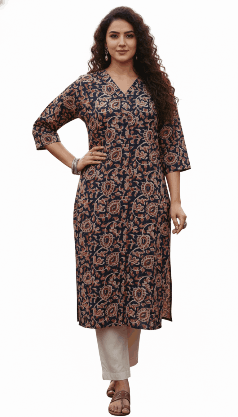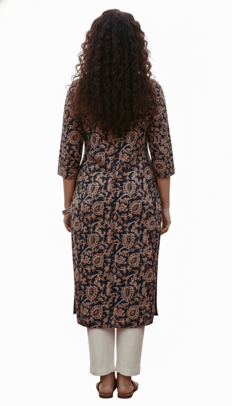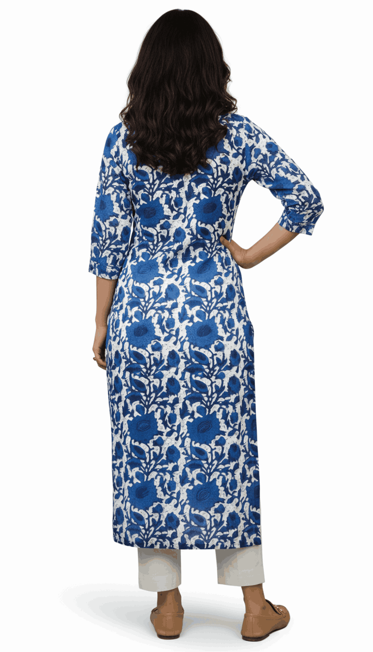 Be the first to review “Flowy Rayon/Cotton Floral Kurta with Signature Neck Pleat”