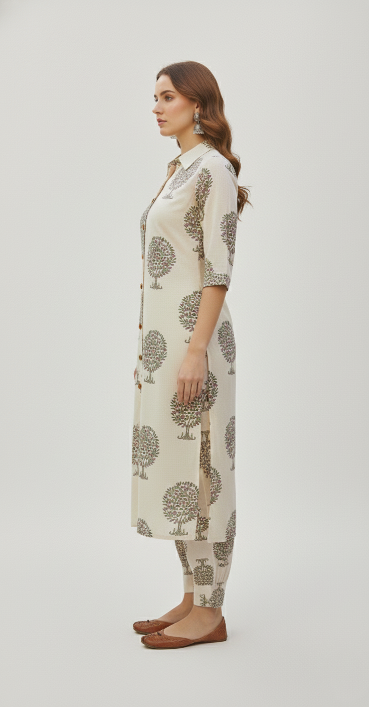 Ivory Tree-Print Rayon Afghani-Style Co-ord Set
