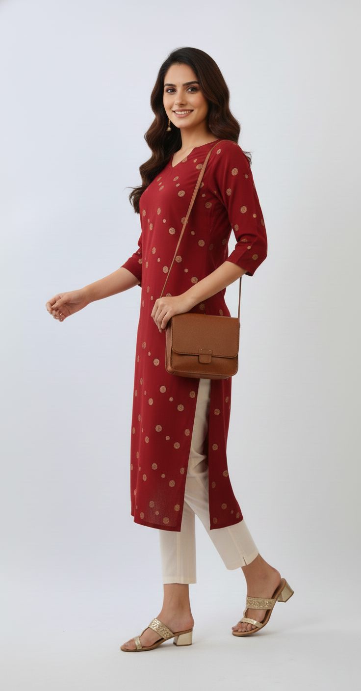 • Color & Print: The kurti is a rich maroon or deep reddish-brown color. It features a simple, repeating gold-toned circular geometrical print scattered across the fabric, adding a festive or dressy element.