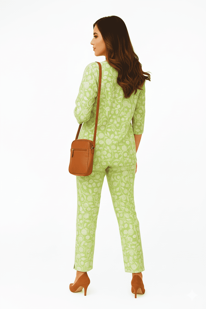 The subtle leaf-inspired print and flattering silhouette make this outfit ideal for both casual outings and relaxed gatherings.