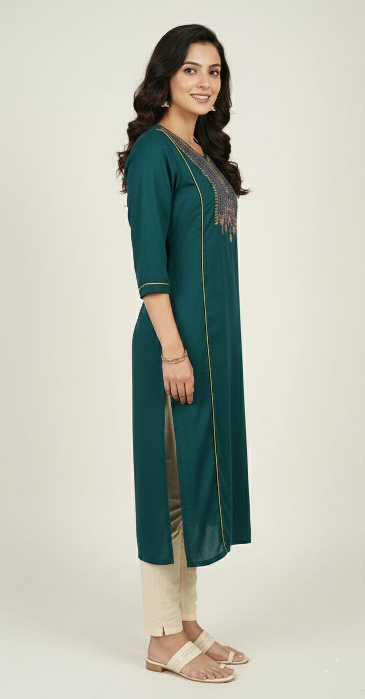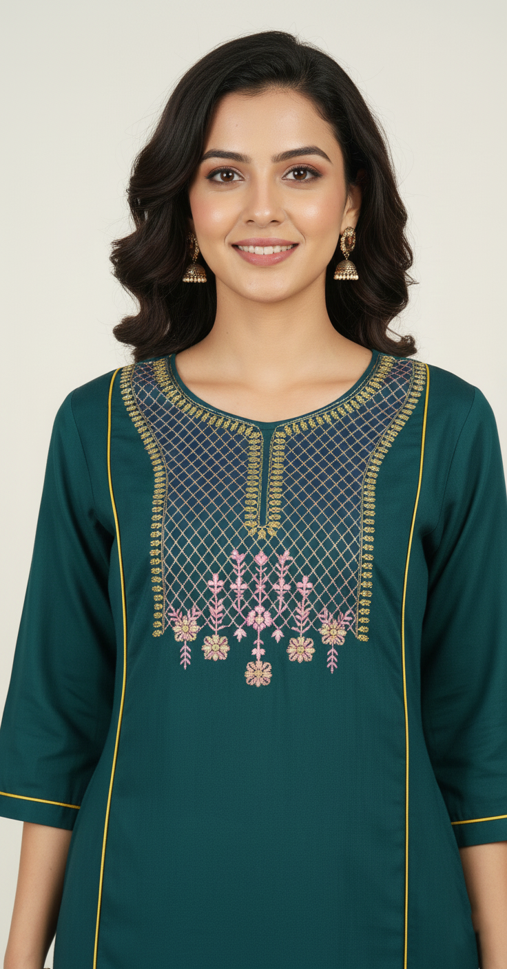 • Color and Fabric: The kurti is a deep teal/dark green color, suggesting an elegant and rich tone. The fabric is rayon.