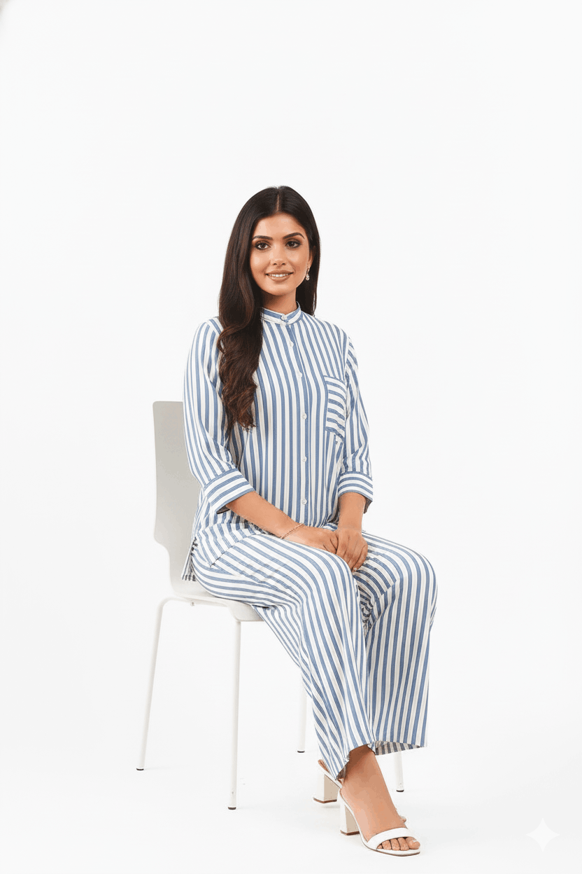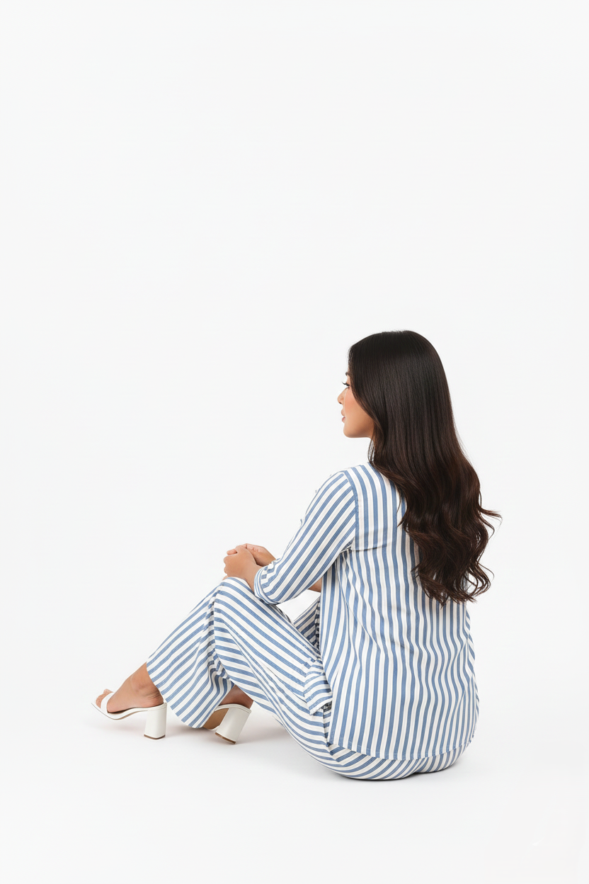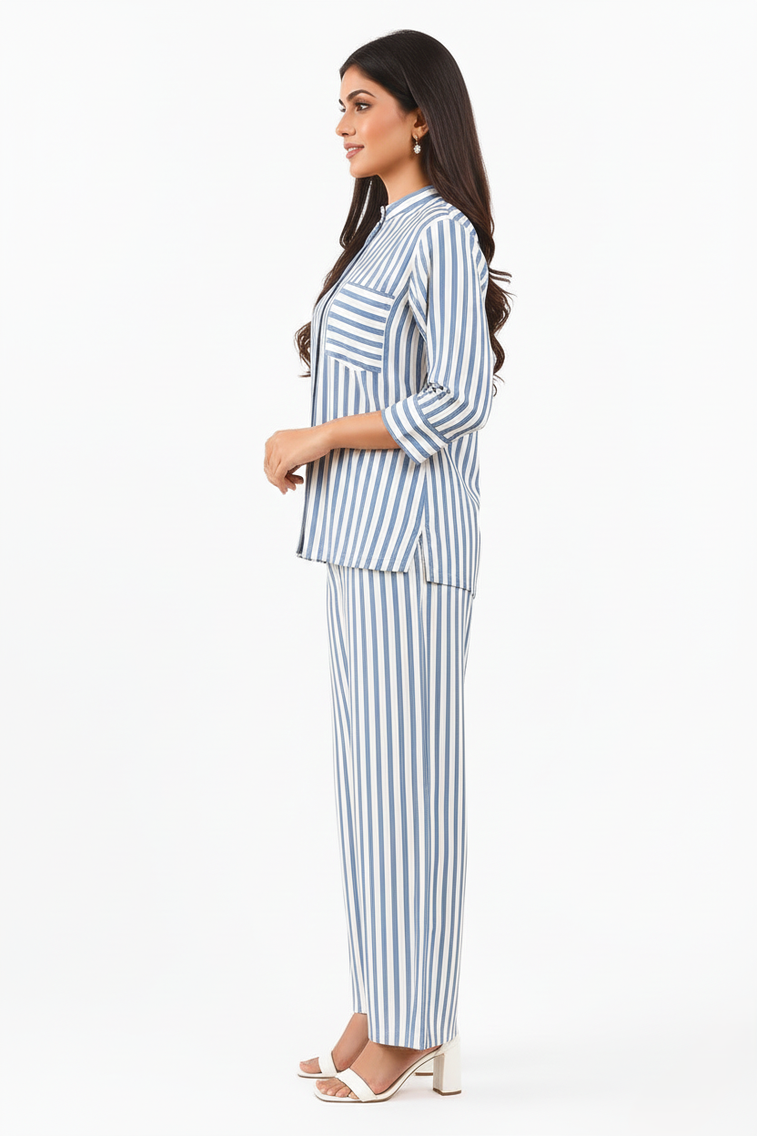 Style: Matching straight-cut or wide-leg palazzo pants with the same striped pattern.