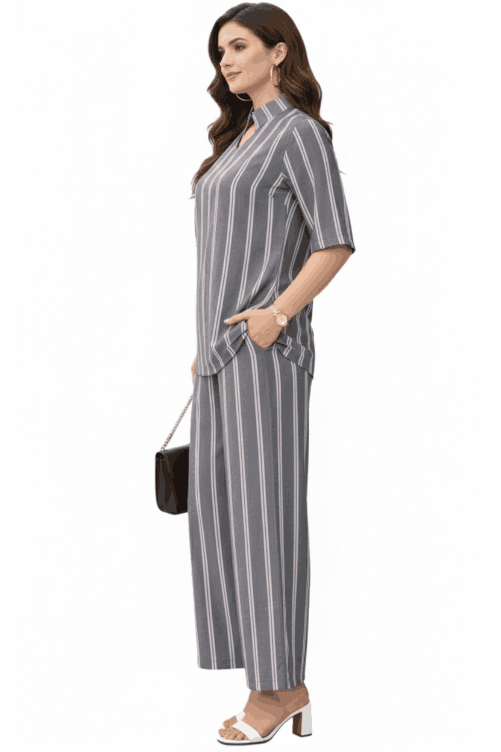Women’s Grey and White Striped Rayon Yarn-Dyed Co-ord Set